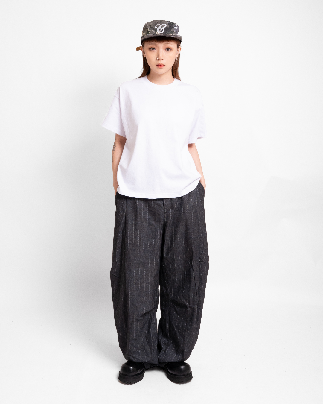 L:腰圍 37-44(彈性腰圍) / 臀圍 61 / 褲襠 37 / 大腿圍 34 / 褲腳寬 26 / 總長 108